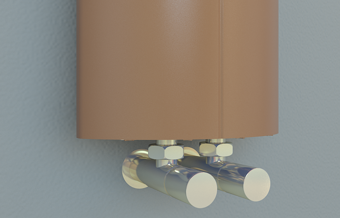 The radiator valves for this product are installed from below - the pipe centres are 50mm